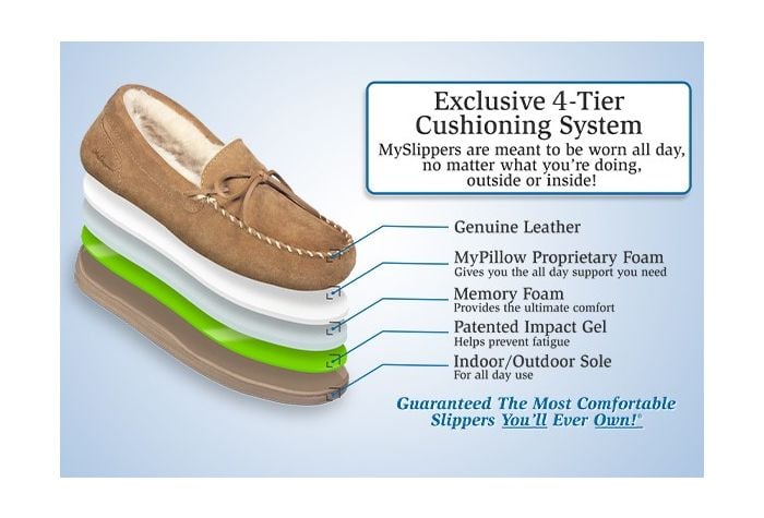 When I created my new MySlippers I wanted it to have everything you could need in a slipper. I wanted a slipper that was more comfortable than anything before it but also durable enough to wear all day. indoors and outdoors. That’s why I developed an exclusive 4-tier cushioning system that combines two layers of foam with a patented impact gel to keep you from wanting to ever take them off. But I didn’t stop there. I finished my MySlippers with beautiful leather suede. cozy faux fur linings and an indoor/outdoor sole. I guarantee these will be the most comfortable slippers you’ll ever own!
